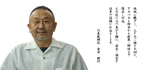 当社は、地域に根ざした総合建設業として、アスベスト除去工事・外構工事・新築工事・解体工事など、暮らしに関わる幅広い工事を手がけております。私は、人とのご縁を何よりも大切にし、友人やお客様、地域の皆さまとの信頼関係を築くことに喜びを感じています。安全と品質を第一に、一つひとつの現場に誠実に向き合い、「頼んで良かった」と思っていただける仕事を心がけてまいりました。これからも、皆さまの暮らしや地域の発展に少しでもお役に立てるよう、社員一同、真心を込めて取り組んでまいります。どうぞよろしくお願いいたします。